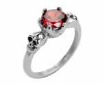 Ladies Red Solitaire Skull Ring Stainless Steel Sizes 5 - 10 A Ladies’ Solitaire Red CZ Skull Ring, Flanked by Two Skull Guardians on each side, Expertly Crafted from Stainless Steel for Ultimate Sparkle and Zero Fuss.