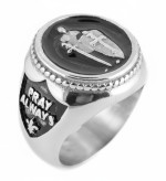 Men's Armor of God Signet Ring Two Tone Round Top Stainless Steel Sizes 8 - 15 The Armor of God Signet Ring Two-Tone design showcases a Raised Silver Shield and Sword set with a Sleek Inaid Black Enamel Background. Its Intricate Design Shines and continues on the sides with “Return with Honor”on one and “Pray Always” the other. This Solid, Strong, Heavy Men's Ring combines Meaningful Symbolism with Bold Style. FREE SHIPPING