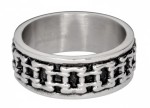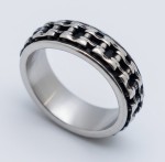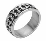 Men's Bike Chain Ring Biker Wedding Band Stainless Steel Sizes 9-14 This Two-Tone Bike Chain Ring Features a Sleek, Modern Design with a Classic Motorcycle Bike Chain Encircling a High-Polished Stainless Steel Band. Measuring 8mm in width, its Black Enamel Backdrop Creates a Bold Statement—Ideal for those Seeking a Ring or a Wedding Band that Conveys Both Adventure and Everyday Charm.