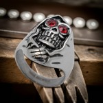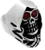 Men's Grim Reaper Ring with Red Eyes Stainless Steel Sizes 8-16 The Grim Reaper Ring is back in Style, now in 316L Stainless Steel because Even Death Deserves Durability. With Fiery Red Eyes that Scream "I'm Watching You" and Black Accents for that Extra Spooky Flair, this Grim Reaper Ring is both Menacing and Manageable. At 1 inch in length, it’s the Perfect Size to Haunt Comfortably All Day Long.