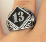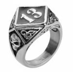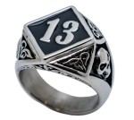 Men's Number "13" Signet Ring with Skulls Stainless Steel Sizes 9-16 The Number "13" Signet Ring Sports a Diamond-Shaped Top Adorned with Skulls and Scrollwork on either side. Sturdy, Weighty, and Solid, it Showcases Raised Silver Details against a Sleek Black Enamel Background, making the Number "13" Pop with Bold Style.