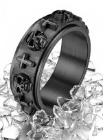 Unisex All Black "Skulls & Crosses" Spinner Ring Stainless Steel Sizes 7 - 13 This Unisex All Black Skulls and Crosses Spinner Ring is your Ultimate Sidekick for Everyday Adventures, Flaunting a Daring Design of Raised Skulls and Crosses around the Entire Band. Made of Indestructible Stainless Steel, it Laughs in the Face of Wear and Tear, with sizes 7 to 13 to fit your Rebellious Finger. The 8mm Band and Spinner Feature make it the Perfect Blend of Edgy and Fidget-Friendly Style for Men and Women Alike. A Must-Have for Any Biker Jewelry fan's Treasure Chest!