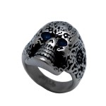 Unisex Silver Tribal Tattoo Skull Ring Blue Crystal Eyes Stainless Steel Sizes 5-10 An Intricately Crafted Silver Tribal Tattoo Skull Ring with Bold Black Accents on Polished Stainless Steel that make the Vivid Blue Crystal Eyes appear to Gaze Right Through You. This Sturdy Skull Ring is a Stylish Choice for Women and also works Perfectly as a Pinky Ring for Men.