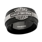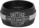 Harley-Davidson Biker Design Stainless Steel Wedding Band - Black & Silver Comfort Fit Band Mod Jewelry® Available in Sizes 10-15 HSR0048 Built for riders who want bold style and everyday comfort, this biker design stainless steel ring works perfectly as a wedding band or a standout everyday piece. The center features a smooth, polished band framed by rough, sculpted textures on each side for a rugged motorcycle-inspired look. The comfort-fit interior makes it feel effortless to wear. Crafted from durable, strong stainless steel, this ring is made to handle daily wear while keeping its sharp finish. Designed by Mod Jewelry.