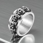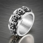 All Skulls Spinner Ring Unisex Wedding Band Biker Stainless Steel Sizes 8-13 Skulls Spinner Ring Featuring Spinning Skulls Encircling the Entire Ring – because Nothing says "Eternal Love" quite like this 11mm Unisex Ring a Bold and Stylish Parade of Marching Stainless Steel Skulls!
