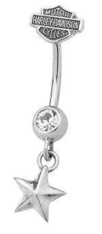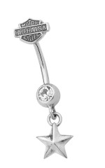 Body Jewelry Harley-Davidson® Star Dangle B&S Logo Bling Navel Ring HDZ0032 Show off your biker style with this officially licensed Harley-Davidson® Bar & Shield logo navel ring. Crafted from durable stainless steel, this 14-gauge belly ring features the iconic Bar & Shield emblem, accented with a sparkling clear crystal and finished with a dangling star charm for added edge and movement. Product Details: