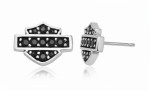 Harley-Davidson® Black Bling Bar & Shield Post Earring Sterling Silver HDE0281 Add a touch of edgy sparkle to your biker style with these Harley-Davidson® Black Bling Bar & Shield Post Earrings. Crafted in sterling silver, each earring (11mm x 8mm) features the iconic outline Bar & Shield logo and adorned with sparkling black crystal stones for subtle yet bold flair. Perfect for everyday wear, rallies, or as a standout Harley accessory for women. Product Features: