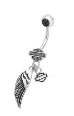 Harley Davidson® Black Onyx Wing B&S Logo Belly Ring 14G Surgical Steel HDZ0058 Show off your biker style with this officially licensed Harley Davidson® body jewelry. The Black Onyx Wing Bar & Shield Logo Belly Ring features a bold, sparkling black onyx top ball paired with a bar & shield Logo at the bottom which holds the detailed Angel Wing and a small iconic Bar & Shield logo outline charm both dangle freely for eye-catching movement. Crafted from high-quality surgical steel, this 14 gauge belly button ring is durable, comfortable, and perfect for everyday wear. Perfect for Harley riders, motorcycle lovers, and anyone who wants edgy, rock-inspired belly jewelry.