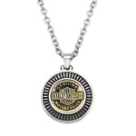 Harley-Davidson® Men's Brass & Steel Bar & Shield Round Biker Pendant - 22" Necklace Made by Mod Jewelry® HSN0050 Officially licensed Harley-Davidson® men’s Bar & Shield pendant necklace by Mod Jewelry®. Designed for riders who live the open-road lifestyle, this striking round biker pendant features the iconic Bar & Shield emblem embedded into a 30mm stainless steel disk with chrome and brass tones for a rugged, masculine look. Crafted from high-quality stainless steel, this durable motorcycle pendant is built for everyday wear. The 22-inch stainless steel chain sits comfortably around the neck, making it the perfect accessory for riding, casual wear, or layering with other biker jewelry. Product Details: