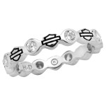 Harley-Davidson® Stacking CZ Bar & Shield Logo Ring Ladies Sterling Silver HDR0170 Create your own bold biker look with this Harley-Davidson® Bar & Shield CZ stacking ring. Designed with alternating the mini Bar & Shield logo with sparkling CZ stones, this eye-catching ring delivers the perfect mix of edge and shine. At 3.5mm wide, this slim band is ideal for stacking with other rings to create a custom layered style. Wear it alone for subtle Harley flair or pair it with additional stacking rings for a more dramatic statement. Crafted for durability and everyday wear, this ring is a must-have for Harley-Davidson® jewelry lovers. Features: