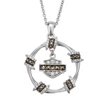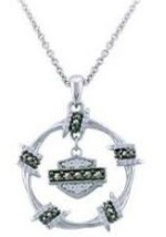 Ladies Harley-Davidson ® Motorcycle Barbwire Circle Biker Necklace HDN0452 This Sterling Silver Ladies Biker Barbwire circle designed Harley-Davidson ® Motorcycle Necklace, 16 to 18 inch adjustable. Having the Harley logo with clean and bright crystals and darker crystals down the center hanging in the middle followed by five more barbs with the bling setting it off and giving it that true female look. Check out the many matching items including matching earrings for that complete set.