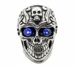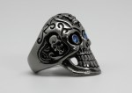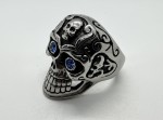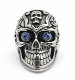 Large Skull Ring Blue Eyes Heavy Biker Gothic Jewelry Men's Stainless Turn heads with this bold and large stainless steel skull ring featuring brilliant blue stone eyes and incredible detailing. The large skull face is enhanced with deep blackened accents, giving it a rugged, high-contrast look. An additional skull design on the top with engraved scrollwork adds a unique edge you won't find on basic skull rings. Made from solid stainless steel, this ring is tough, durable, and resistant to tarnish-perfect for everyday wear.