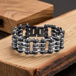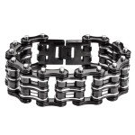 Men's Black Motorcycle Double Wide Primary Bike Chain Stainless Steel Biker Bracelet 5 Lengths A true motorcycle primary bike chain stainless steel bracelet. With the true color of shinny black with a small accent of silver sets this piece off. Running at one inch wide with double rows, not thick at all, just wide. This men's piece feels just right. Made with strong and heavy 316L stainless steel. FREE SHIPPING
