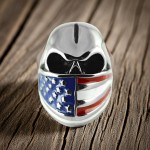 Men's Flag Bandanna Skull Ring USA Flag Enameled Stainless Steel Sizes 8-16 This Stainless Steel Skull is Wearing a Brightly Enameled Red White and Blue American flag Bandanna with Blackened Menacing Eyes. Solid and Forged from a single piece of High Polished Stainless Steel, it is Extremely Durable, weighing over 30 grams. A Great Ring for Showing Off the Good Ole U.S.A.