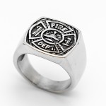 Unisex Firefighter's Maltese Cross Ring Black Stainless Steel Firefighter Ring Sizes 8-16 This Unisex Firefighter's Ring in Stainless Steel. The Black Firefighter's Maltese Cross Ring has many Features. the words "FIRE" and "DEPT" and with Images of a Fire Hydrant, a Ladder and a Helmet are all Raised within the Maltese Cross shape. Then the In-Laid Black Enameled Background Really Shows Off all this Detail. The Rounded Square top measures 20 x 20mm and Forged of a Single Piece of 316L Stainless Steel. This 1st Responder Ring is Extremely Durable. No matter whether you are a Volunteer Firefighter or The Chief and for Anyone who Ranks in between! This Firefighter Ring is a Bold Way to Showcase your Commitment to Your Company.